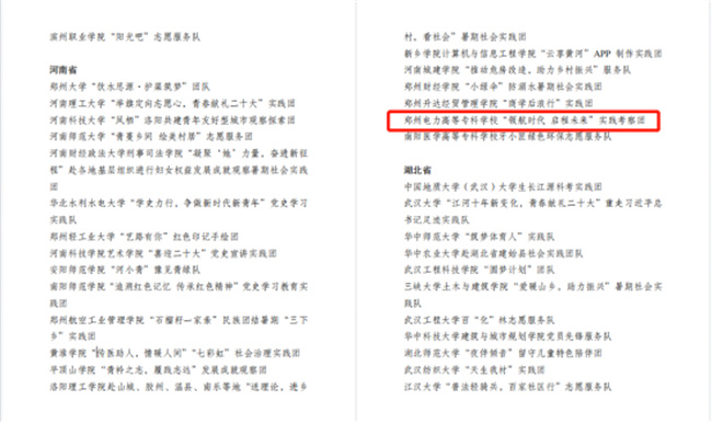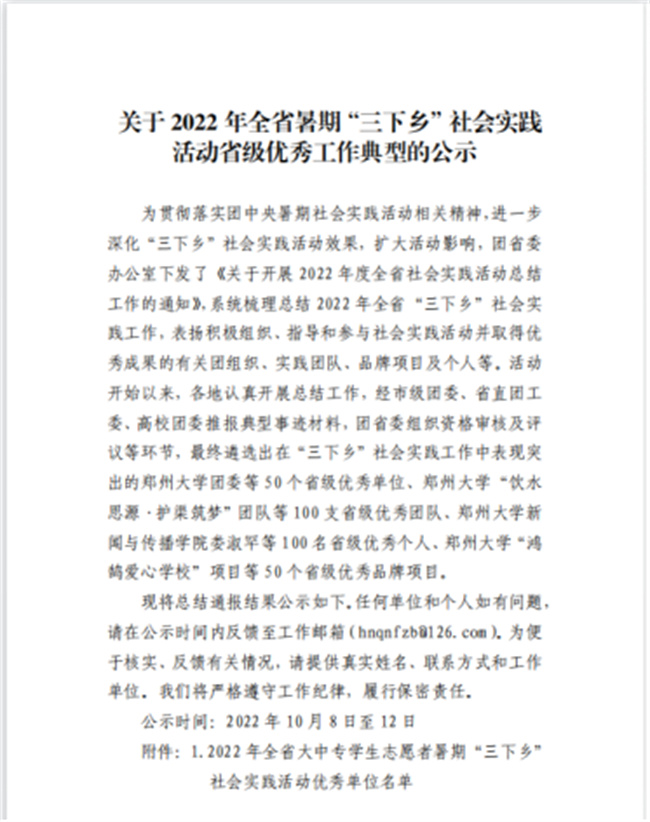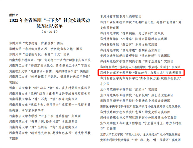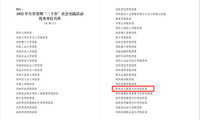 中新河南網(wǎng)10月21日電(李安杰) 近日,共青團(tuán)中央對(duì)2022年全國(guó)大中專學(xué)生志愿者暑期文化科技衛(wèi)生“三下鄉(xiāng)”社會(huì)實(shí)踐活動(dòng)中表現(xiàn)突出的優(yōu)秀集體和個(gè)人進(jìn)行了通報(bào)表彰。經(jīng)學(xué)校團(tuán)委層層推報(bào),“領(lǐng)航時(shí)代 啟程未來(lái)”實(shí)踐考察團(tuán)(鄭州電力高等?茖W(xué)校電氣工程學(xué)院)榮獲2022年全國(guó)“三下鄉(xiāng)”社會(huì)實(shí)踐“優(yōu)秀團(tuán)隊(duì)”榮譽(yù)稱號(hào)(全省共20個(gè)團(tuán)隊(duì)入選,其中?圃盒H兩個(gè)),是繼學(xué)校團(tuán)委獲得全國(guó)“三下鄉(xiāng)”社會(huì)實(shí)踐“優(yōu)秀單位”之后,再次受到共青團(tuán)中央的表彰!