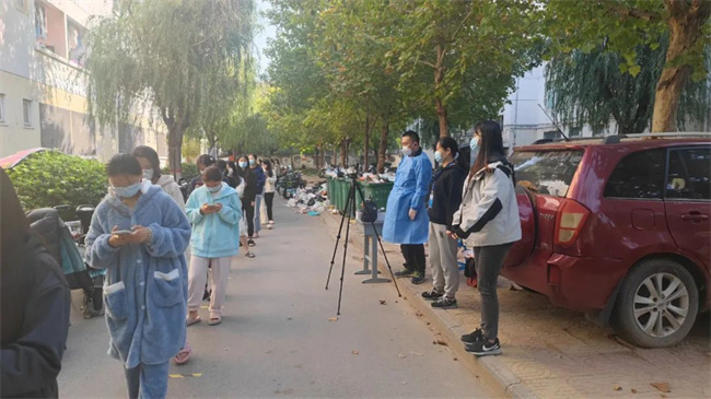 管理學(xué)院分團(tuán)委書(shū)記張彩虹、分團(tuán)委副書(shū)記袁芳、輔導(dǎo)員馬會(huì)鵬在核酸檢測(cè)現(xiàn)場(chǎng)