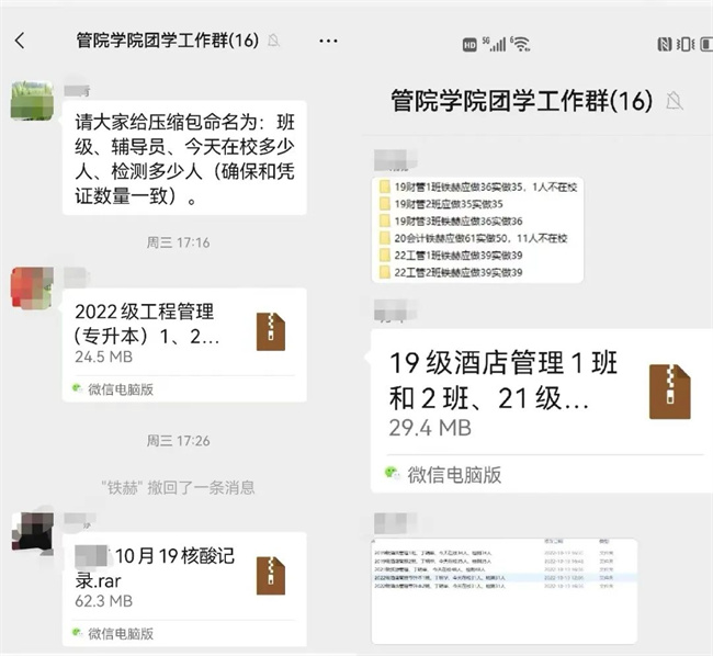 零報(bào)告和核酸檢測(cè)是做好疫情防控工作的重要一環(huán),為了讓同學(xué)們更深刻地認(rèn)識(shí)到打卡的重要性,輔導(dǎo)員老師們從未打卡同學(xué)、打卡截止時(shí)間、監(jiān)督打卡的班委、輔導(dǎo)員自身等不同角度出發(fā),每天盡可能用不同的方式通知或提醒學(xué)生按時(shí)進(jìn)行核酸檢測(cè)和健康打卡。健康日?qǐng)?bào)保持實(shí)時(shí)跟蹤,學(xué)生中的集中健康監(jiān)測(cè)人數(shù)、校外隔離人數(shù)、未返校人數(shù)……每位輔導(dǎo)員老師對(duì)自己所帶的學(xué)生全部了然于胸,以高度的責(zé)任心和強(qiáng)烈的使命感,做好防疫摸排和服務(wù)工作。