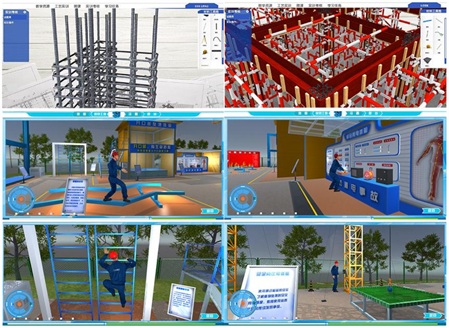 “四元融通”聯(lián)合開發(fā)理虛實一體化教學資源,以虛助實,突破難點。利用BIM技術虛實結合的特點,聯(lián)合河南建協(xié)、中建七局、中鐵二十局、河南天工、廊坊中科、廣州中望、北京廣聯(lián)達、西安三好等行業(yè)、企業(yè)、證書、競賽的相關方,開發(fā)崗課賽證“四元融通”特色的虛擬仿真教學資源。對接BIM基礎應用、專項應用、綜合管理等崗位群,基于真實工程項目、典型安全事故、復雜工序,開發(fā)《基礎工程施工》等理虛實一體的模塊化課程18門、方艙醫(yī)院等工程項目仿真33個、洞口墜落等安全事故仿真63個、異形屋面等復雜工序仿真782個,融入免共振微擾動沉樁等“建筑五新”85項,有效解決建筑實訓高風險、難再現(xiàn)、高消耗等痛點。同時,開發(fā)楊靖宇革命紀念館等紅色教育仿真資源34個、時光寶盒國寶文物等素質教育仿真資源15個、云上鄒莊美麗鄉(xiāng)村等課程思政仿真資源45個,有效解決公共基礎課教學的應用場景難實施、難觀摩、高投入等痛點。應用BIM技術以虛助實,有景、有趣、有效、有用,突破理實一體化的難點,形成了理虛實一體的模塊化、系統(tǒng)化虛擬仿真實訓體系。
