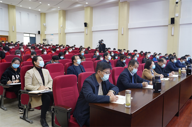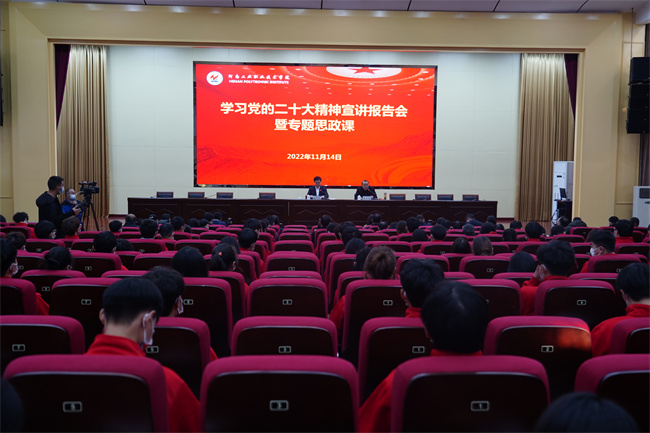 溫道軍以《學(xué)思踐悟凝心鑄魂 踔厲奮發(fā)勇毅前行》為題,從“深刻認識黨的二十大的重大歷史意義、牢牢把握新時代十年的偉大變革、深入學(xué)習二十大報告的創(chuàng)新理論、緊緊錨定新時代職業(yè)教育發(fā)展目標、堅決扛起新時代新征程的歷史使命”五個方面入手,闡述了黨的二十大的重大意義,全面解讀了二十大報告,講解了過去五年工作和新時代十年的偉大變革,重點結(jié)合了報告中與教育、科技、人才等相關(guān)的論述,分析了學(xué)校發(fā)展面臨的機遇挑戰(zhàn),進一步明確重點任務(wù)舉措,對青年一代為青春理想而拼搏奮斗提出了殷殷囑托和期望。