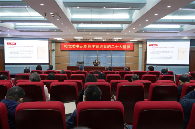 周保平以“一個主題、一個中心任務(wù)、三件大事、四個方面里程碑意義、兩個結(jié)合、六個堅持、中國式現(xiàn)代化五個特征、三方面重點工作、兩個全面、五個必由之路”等十個關(guān)鍵詞語為切入點,圍繞“精研細學(xué),深刻認識黨的二十大重大意義;學(xué)深悟透,準確把握黨的二十大精神實質(zhì);細照篤行,辦好人民滿意的高職教育;勇?lián)姑,爭做堪當民族?fù)興大任的時代新人”等四個方面,以生動鮮活的語言、豐富翔實的資料,全面、準確、完整闡釋了黨的二十大精神,對黨員干部和廣大師生提出了期望和要求。她指出,黨的二十大繼往開來、舉旗定向,擔(dān)負起全黨的重托和人民的期待,在政治上、理論上、實踐上取得了一系列重大成果,為全面建設(shè)社會主義現(xiàn)代化國家、全面推進中華民族偉大復(fù)興而團結(jié)奮斗,具有劃時代的里程碑意義。