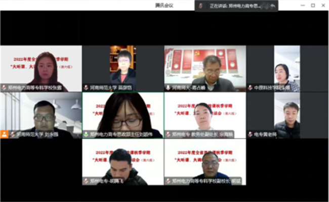 根據(jù)工作安排,專家組首先隨機抽取學(xué)校三位教師的課程,采用騰訊會議線上聽課的方式深入學(xué)校思政課課堂,分別于11月21日、22日聽取了黃克非、張露兩位老師的《習(xí)近平新時代中國特色社會主義思想概論》課程和胡騰飛老師的《思想道德與法治》課程。11月29日下午,通過騰訊會議召開了座談會。調(diào)研組組長、河南師范大學(xué)馬克思主義學(xué)院院長蔣占峰、調(diào)研組成員苗彥愷、朱媛、劉永強,鄭州電力高專副校長胡斌、教務(wù)處副處長宗海煥、思政部主任劉穎偉及3位教師代表參加了座談。