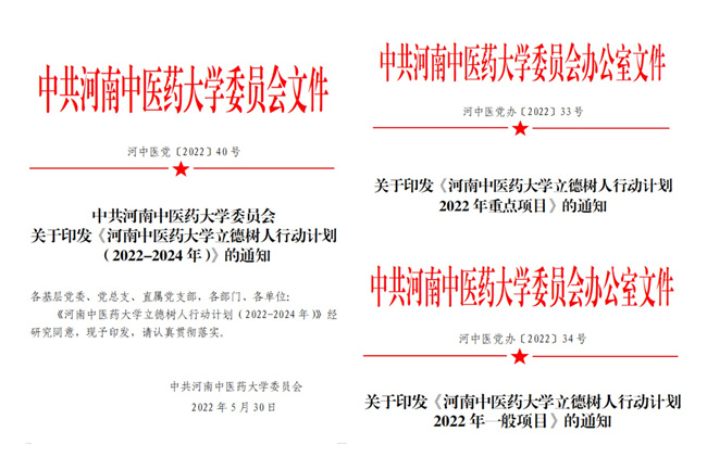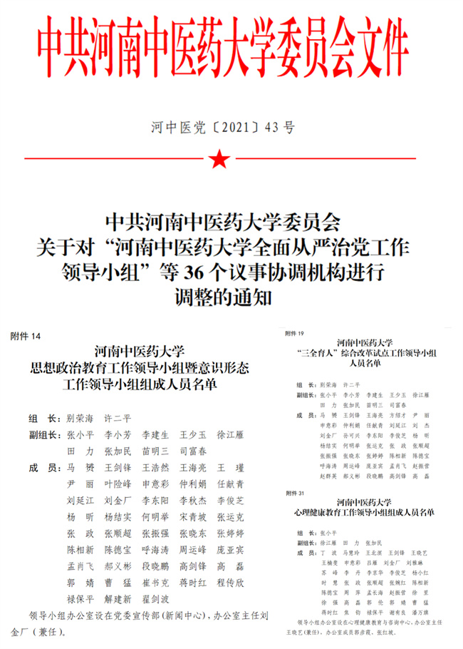 (一)強化組織領導,堅定“主心骨”。校黨委扛牢為黨育人、為國育才的使命擔當,不斷提高政治站位,增強行動自覺。學校成立有黨委書記、校長任組長,主管副書記任常務副組長,其他校領導任副組長,各部門各單位負責人為成員的思想政治教育工作領導小組。根據(jù)形勢任務需要,及時成立三全育人、中醫(yī)藥特色文化建設、心理健康教育、立德樹人等工作領導小組,不斷拓展工作領域,統(tǒng)籌育人力量,構(gòu)建了黨委統(tǒng)一領導、黨政齊抓共管、職能部門協(xié)同推動、基層學院(書院)積極落實的常態(tài)化與長效化工作機制。2018年,學校成為首批河南省“三全育人”綜合改革試點高校。