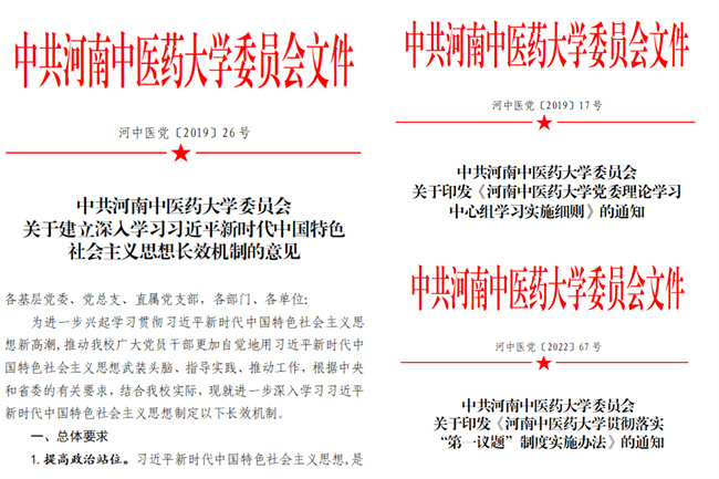 (二)強化思想引領,點亮“指路燈”。學校黨委高舉思想之旗,把學懂弄通做實習近平新時代中國特色社會主義思想作為首要政治任務,嚴格落實“第一議題”制度,充分發(fā)揮校處兩級黨委中心組理論學習的引領示范作用,及時跟進學習領悟習近平總書記重要講話和重要指示批示精神。2019年制定《關(guān)于建立深入學習習近平新時代中國特色社會主義思想長效機制的意見》《黨委理論學習中心組學習實施細則》,2022年出臺《貫徹落實“第一議題”制度實施辦法》,切實增強“四個意識”,堅定“四個自信”,做到“兩個維護”。黨委理論學習中心組聚焦習近平總書記關(guān)于高等教育和中醫(yī)藥發(fā)展的重要講話和重要指示批示精神,集中學習研討140次。黨委理論學習中心組成員堅持對標對表,強化學思踐悟,在黨報黨刊發(fā)表理論文章50余篇,撰寫心得體會500余篇。