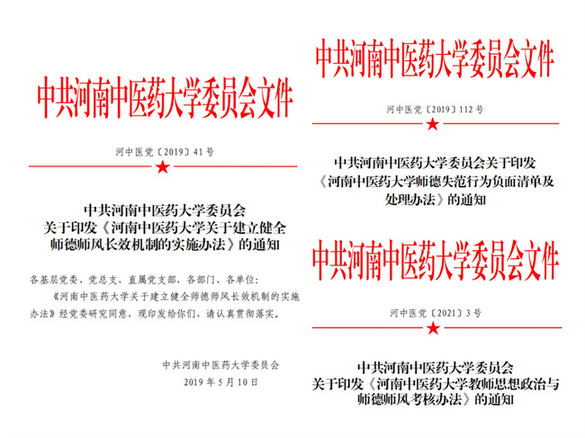 1.師德建設強勁有力。加強師德師風建設,于2020年成立教師工作部,出臺《關(guān)于建立健全師德師風長效機制的實施辦法》《教職工榮譽體系設置方案》《教師思想政治與師德師風考核辦法》《師德失范行為負面清單及處理辦法》等制度,構(gòu)建長效機制,樹立鮮明導向。堅持以德為先,將師德納入教師考核評價體系,考核結(jié)果貫穿于教師職務晉升、職稱評審、評比獎勵等環(huán)節(jié),嚴格執(zhí)行師德師風“一票否決”制。持續(xù)開展師德師風主題教育,積極開展“出彩中醫(yī)人”“我心目中的好導師”“仲景教學名師”等評選活動。該校涌現(xiàn)出“全國優(yōu)秀教師”邵素菊、張琳琪,“全國醫(yī)德標兵”張懷亮,“出彩河南人‘最美教師’”崔姍姍,河南省首屆“醫(yī)德醫(yī)風模范”牛朝陽,河南省高校黃大年式教師團隊——“中藥學教師團隊”等一大批醫(yī)德師德高尚的教師群體。