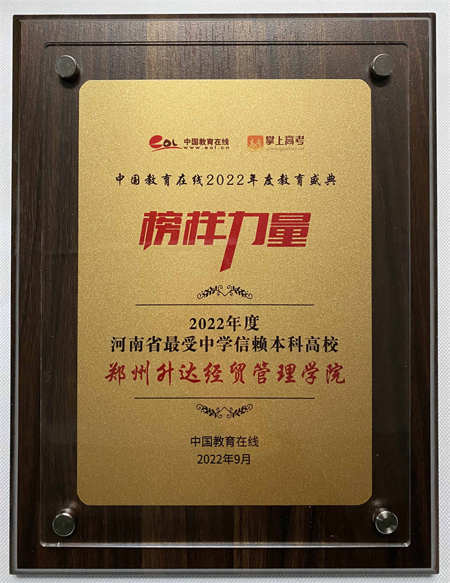 活動經(jīng)過前期征集、專家會審、綜合評審等階段,鄭州升達(dá)經(jīng)貿(mào)管理學(xué)院從全國眾多高校中脫穎而出,獲得 “2022年度河南省最受中學(xué)信賴本科高校”獎項。這充分體現(xiàn)了學(xué)校辦學(xué)成果得到了社會的廣泛認(rèn)可和高度好評。