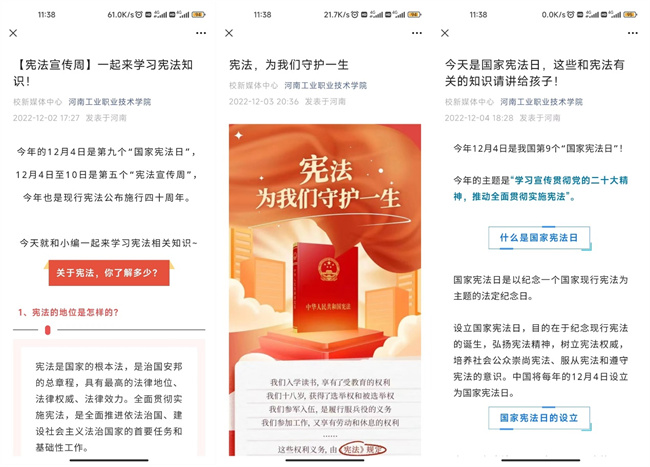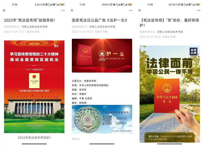 河南工業(yè)職業(yè)技術(shù)學(xué)院“憲法宣傳周”系列活動(dòng)的順利開展,營(yíng)造了濃厚的“學(xué)習(xí)憲法、尊崇憲法”的校園法治文化氛圍,進(jìn)一步增強(qiáng)了廣大師生的法治觀念和法律意識(shí),促進(jìn)了普法育人工作的順利開展,提升了河南工業(yè)職業(yè)技術(shù)學(xué)院依法治校能力。
