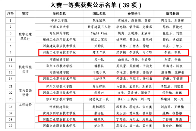 該校建筑工程學(xué)院參賽隊(duì)與眾多本科院校同臺(tái)競(jìng)技,斬獲佳績(jī),獲得數(shù)字化建筑設(shè)計(jì)一等獎(jiǎng)1項(xiàng)、二等獎(jiǎng)1項(xiàng),機(jī)電深化設(shè)計(jì)一等獎(jiǎng)1項(xiàng),室內(nèi)裝飾設(shè)計(jì)一等獎(jiǎng)1項(xiàng)、二等獎(jiǎng)1項(xiàng),工程造價(jià)一等獎(jiǎng)1項(xiàng)、二等獎(jiǎng)1項(xiàng),工程管理二等獎(jiǎng)2項(xiàng),數(shù)字化結(jié)構(gòu)設(shè)計(jì)三等獎(jiǎng)1項(xiàng)。同時(shí),該校還獲得優(yōu)秀組織獎(jiǎng)。