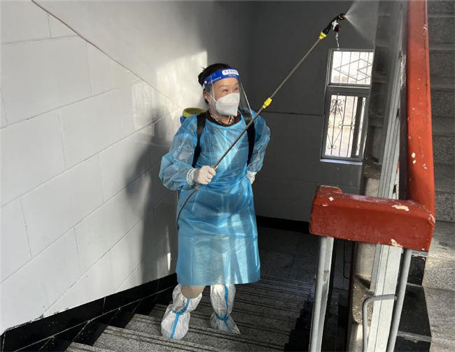 一桶藥,四十斤,瘦弱身軀也背得。張霞來到教學樓,從一樓到六樓,臺階一步步地爬,藥水一股股地噴,汗珠一道道地流。肩膀勒疼了,挪挪背帶,右臂舉酸了,換成左臂。三年防疫,五次駐校,不知她爬過多少臺階,背過多少藥桶,流過多少汗水,而那柔弱的肩上又不知有多少條勒痕。