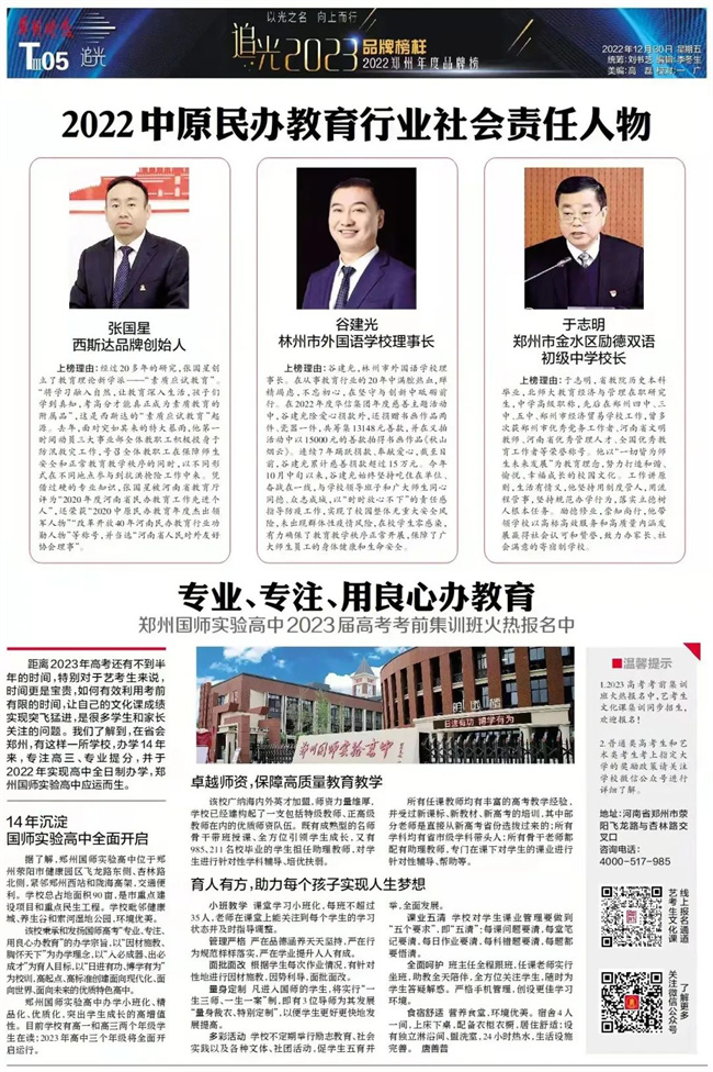 (林州市外國語學校理事長谷建光榮獲“2022中原民辦教育行業(yè)社會責任人物”榮譽稱號)