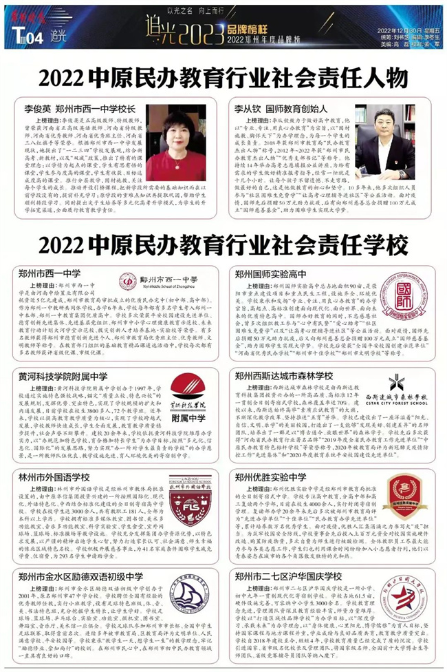 中新河南網1月12日電 近日,由鄭州晚報舉辦的“以光之名 向上而行”2023追光品牌榜樣比賽中,林州市外國語學校理事長谷建光榮獲“2022中原民辦教育行業(yè)社會責任人物”榮譽稱號,林州市外國語學校榮獲“2022中原民辦教育行業(yè)社會責任學校”榮譽稱號。
