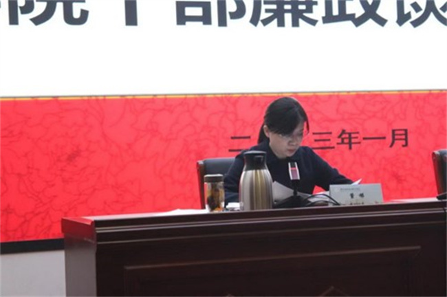 黨委副書記董娣通報了近期的典型案例并代表學院黨委向全體中層干部做廉政談話。她要求學院廣大黨員干部立足新發(fā)展階段、貫徹新發(fā)展理念、構(gòu)建新發(fā)展格局,主動做到敬畏崗位、敬畏權(quán)力、敬畏事業(yè)。不斷提高政治站位,增強拒腐防變“免疫力”,凈化自己的社交圈,全面架起拒腐防變的“高壓線”。不斷提高履職本領(lǐng),做到勤學、勤思、勤用,以更加昂揚的斗志、更加務實的作風做學院各項事業(yè)發(fā)展的“領(lǐng)頭羊”,積極推進學院高質(zhì)量發(fā)展。
