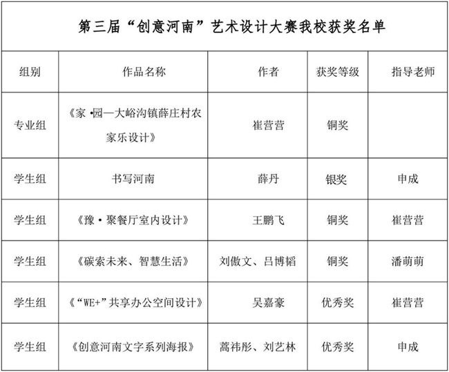近年來(lái),學(xué)院高度重視人材培養(yǎng)與教學(xué)實(shí)踐活動(dòng),大力支持鼓勵(lì)教師學(xué)生積極創(chuàng)新,創(chuàng)作,把學(xué)生在課堂上所學(xué)到的知識(shí)運(yùn)用到創(chuàng)作比賽中去。當(dāng)收到此次大賽的《通知》后,學(xué)院高度重視并積極組織師生踴躍參賽,數(shù)名師生積極準(zhǔn)備,共累計(jì)推薦二十余份作品參加比賽。經(jīng)大賽評(píng)委會(huì)專家評(píng)審,最終藝術(shù)學(xué)院教師崔營(yíng)營(yíng)的作品《家·園》獲得專業(yè)組銅獎(jiǎng);薛丹同學(xué)的作品《書寫河南》榮獲學(xué)生組銀獎(jiǎng);王鵬飛同學(xué)的作品《豫·聚餐廳室內(nèi)設(shè)計(jì)》、劉傲文和呂博韜同學(xué)的作品《碳索未來(lái)、智慧生活》榮獲學(xué)生組銅獎(jiǎng),蒿祎彤和劉藝林同學(xué)的作品《創(chuàng)意河南文字系列海報(bào)》、吳嘉豪同學(xué)的作品《“WE+”共享辦公空間設(shè)計(jì)》榮獲學(xué)生組優(yōu)秀獎(jiǎng)。