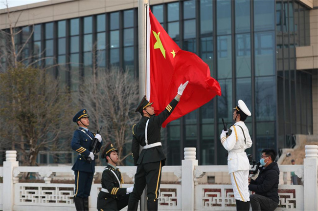 活動(dòng)伊始,國(guó)旗護(hù)衛(wèi)隊(duì)邁著整齊的步伐入場(chǎng)。在慷慨激昂、鏗鏘有力的《義勇軍進(jìn)行曲》樂曲中,鮮艷的五星紅旗冉冉升起,全體人員行注目禮,向國(guó)旗致以最崇高的敬意。