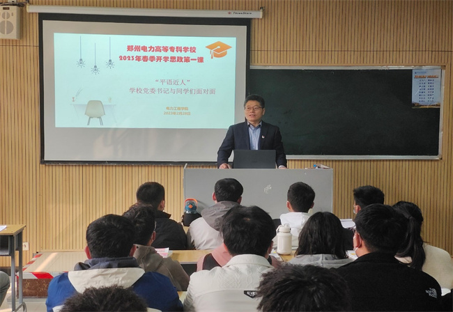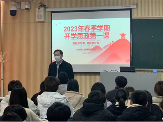 2月24日上午,鄭州電力高等?茖W校黨委委員、副校長黃鵬走進軟件技術專業(yè)學生課堂,為同學們講授2023年春季學期“開學思政第一課”,100余名師生代表現(xiàn)場聆聽了講座,其余學生通過網絡直播線上收看學習。黃校長結合學校發(fā)展形勢及時代特點,對青年學生的成長成才提出了幾點希望和要求:一是要認識“大”與“小”;二是要做到能“上”能“下”;三是要品味大學百味;四要做有為青年。他勉勵同學們要堅定不移聽黨話、跟黨走,立志做有理想、敢擔當、能吃苦、肯奮斗的新時代好青年。