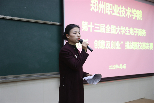 本次大賽邀請了學校招生就業(yè)服務中心主任蔡紅、電子商務學院書記張慧珠、電子商務學院院長周文超、全球(鄭州)跨境電商研究院特聘教授張文勇、電子商務學院任方軍教授和楊中昭教授等人出席。同時邀請到了河南省高校雙創(chuàng)工作負責人楊馮圓教授、教育部優(yōu)秀創(chuàng)新創(chuàng)業(yè)導師岳亮、天明集團健康板塊副總經理王杰和鄭州水工機械有限公司生產運維部經理韓錦鐸等校外專家蒞臨評審和指導。