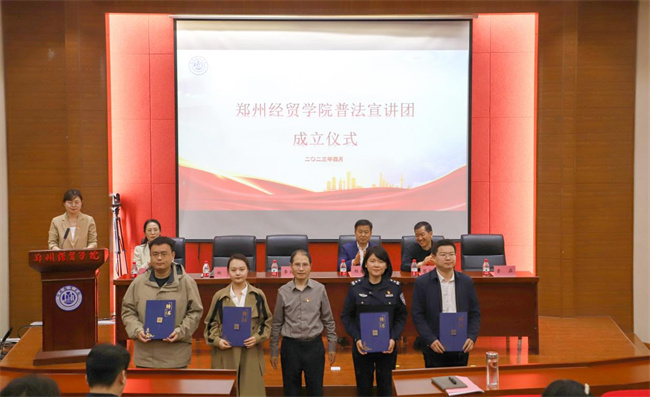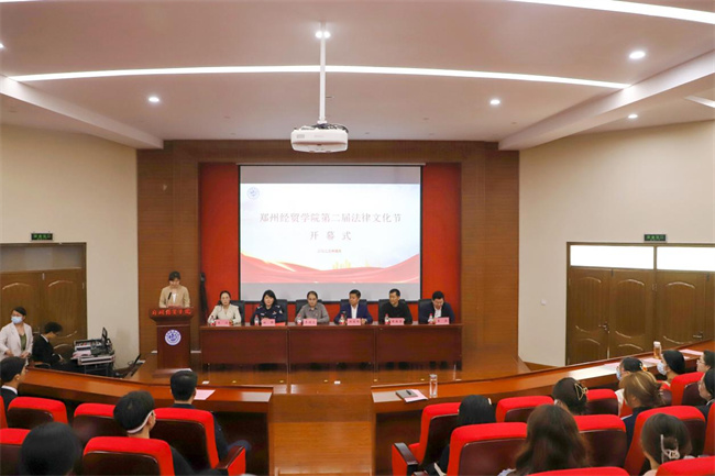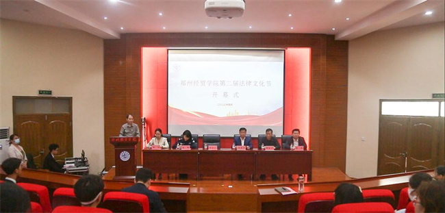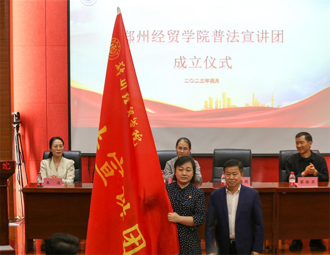 校長助理楊德明向鄭州經(jīng)貿學院普法宣講團團長授旗,并宣布鄭州經(jīng)貿學院第二屆法律文化節(jié)開幕。