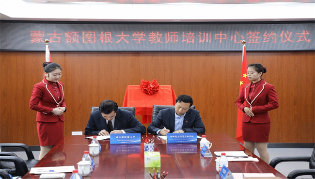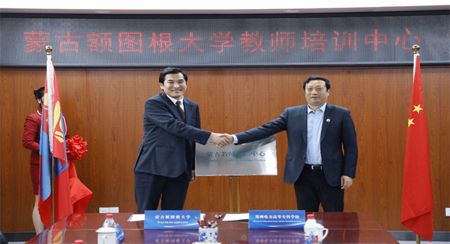 會上,楊小琨副校長進行了熱情洋溢的致辭,從悠久深厚的歷史底蘊、特色鮮明的行業(yè)辦學(xué)、設(shè)施完善的教學(xué)硬件、質(zhì)效雙高的職業(yè)培訓(xùn)和創(chuàng)新模式的國際交流5個方面簡潔、全面地對鄭州電力高等?茖W(xué)校進行了介紹,并表示在未來的合作中聚焦高質(zhì)量發(fā)展,持續(xù)深化人文交流與教育合作。蒙古額圖根大學(xué)副校長艾德賽汗(Nyamzagd IDERSAIHAN)表示蒙古額圖根大學(xué)于2001年建校后快速發(fā)展,作為蒙古重點大學(xué),曾獲得“蒙古最好環(huán)境學(xué)校”稱號;擁有醫(yī)學(xué)、護理學(xué)、商學(xué)、會計學(xué)等24個本科專業(yè),同時建立的還有碩士和博士培養(yǎng)點;大學(xué)始終秉承為社會培養(yǎng)有能力、有思想、有責(zé)任感的復(fù)合型人才的宗旨,深耕于高質(zhì)量高等教育教育二十余載,希望此次簽約可以與中國在學(xué)術(shù)、技術(shù)和人文方面有更深、更長遠(yuǎn)的合作。隨后雙方簽訂合作備忘錄并共同為“蒙古教師培訓(xùn)中心”揭牌。