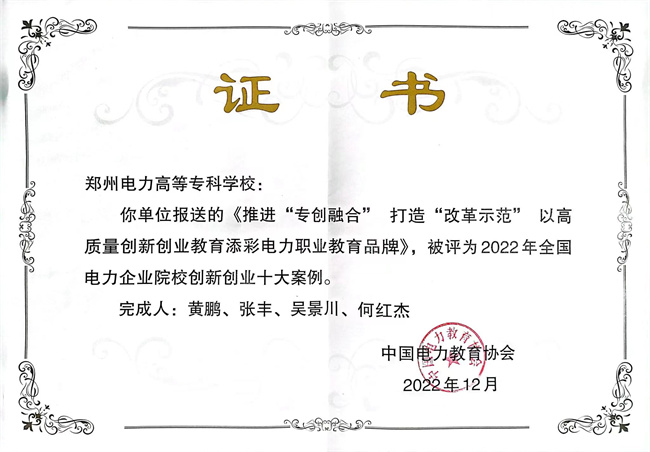 近年來(lái),鄭州電力高等專(zhuān)科學(xué)校以新時(shí)代“兩越”匠心培養(yǎng)能源革命踐行者、美好生活服務(wù)者,辦人民滿(mǎn)意的電力職業(yè)教育,在創(chuàng)新創(chuàng)業(yè)教育改革實(shí)踐中深入探索,構(gòu)建形成了電力特色大學(xué)生創(chuàng)新創(chuàng)業(yè)教育“專(zhuān)創(chuàng)融合6163模式”,卓越提升了學(xué)生的學(xué)習(xí)能力、實(shí)操能力、適應(yīng)能力、創(chuàng)新能力,增值人才培養(yǎng)高質(zhì)量、賦能學(xué)生核心競(jìng)爭(zhēng)力、促進(jìn)充分高質(zhì)量就業(yè),創(chuàng)新創(chuàng)業(yè)三大賽連創(chuàng)佳績(jī),學(xué)生榮獲首屆河南省大學(xué)生“創(chuàng)新之星”,項(xiàng)目入選河南省大學(xué)生創(chuàng)業(yè)培優(yōu)計(jì)劃,創(chuàng)新引領(lǐng)創(chuàng)業(yè)、創(chuàng)業(yè)帶動(dòng)就業(yè),畢業(yè)生去向落實(shí)率連續(xù)三年98.50%左右,教育部高校就業(yè)反饋綜合評(píng)價(jià)連續(xù)為A級(jí)。鄭州電力高等專(zhuān)科學(xué)校在2022年全省高校就業(yè)創(chuàng)業(yè)工作會(huì)議典型發(fā)言(專(zhuān)科唯一),入選全國(guó)高校畢業(yè)生就業(yè)創(chuàng)業(yè)工作典型案例學(xué)校、河南省首批深化創(chuàng)新創(chuàng)業(yè)教育改革示范高校,榮獲國(guó)家技能人才培育突出貢獻(xiàn)單位、國(guó)家電網(wǎng)職業(yè)教育和技能人才隊(duì)伍建設(shè)先進(jìn)集體、“河南省五一勞動(dòng)獎(jiǎng)狀”,高質(zhì)量發(fā)展碩果及經(jīng)驗(yàn)被中央廣播電視總臺(tái)新聞?lì)l道、《人民日?qǐng)?bào)》《光明日?qǐng)?bào)》《中國(guó)教育報(bào)》《河南日?qǐng)?bào)》等主流媒體宣傳推廣。