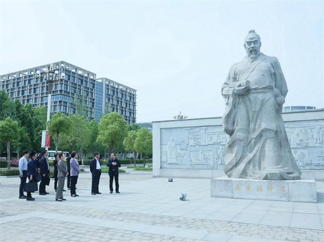 與會領(lǐng)導、專家在仲景廣場了解醫(yī)圣張仲景生平事跡