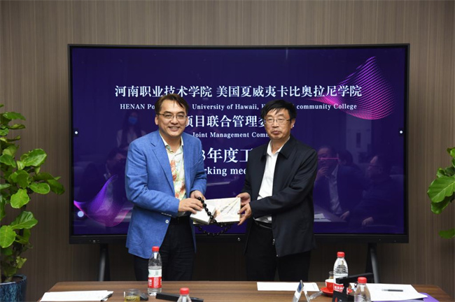 中新河南網(wǎng)5月13日電(師琳琳) 5月9日下午,河南職院召開與美國夏威夷卡比奧拉尼學(xué)院合作辦學(xué)項(xiàng)目聯(lián)合管理委員會(huì)2023年度工作會(huì)。夏威夷卡比奧拉尼學(xué)院國際部主任CY FENG,卡比奧拉尼學(xué)院中國區(qū)首席代表?xiàng)畎亍:幽下氃盒iL梅樂堂,黨委副書記、紀(jì)委書記田華,副校長王皓,國際合作交流處、文化旅游學(xué)院、財(cái)經(jīng)管理學(xué)院和數(shù)字創(chuàng)意與設(shè)計(jì)學(xué)院相關(guān)負(fù)責(zé)人參會(huì)。王皓主持會(huì)議。