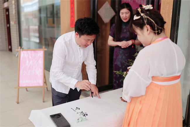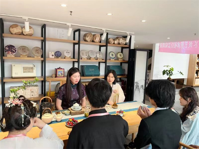 大家品飲著林艷親自采摘炒制的金剛臺(tái)雨前毛尖,一邊吟誦:一碗喉吻潤(rùn)。二碗破孤悶。三碗搜枯腸,惟有文字五千卷。四碗發(fā)輕汗,平生不平事,盡向毛孔散。五碗肌骨清。六碗通仙靈。七碗吃不得也,唯覺(jué)兩腋習(xí)習(xí)清風(fēng)生。在悠揚(yáng)的音樂(lè)聲中沉浸式體驗(yàn)茶仙盧仝的煎茶道。