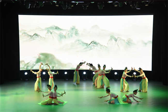 展演在舞蹈《成長在祖國的懷抱》中拉開序幕,音樂學院學前教育專業(yè)的同學們以優(yōu)美的舞姿,生動形象地詮釋了生長在祖國的懷抱里、在黨的陽光下快樂成長的拳拳之心。李娜 、翟冰雨等同學深情演繹的《春風十萬里》,用歌曲再現(xiàn)了“枝頭桃花紅,陌上楊柳綠,這方才播種,那邊又開犁,燕子飛來了,銜來滿嘴泥”的春天景象,歌頌我們偉大祖國朝氣蓬勃、欣欣向榮的大好局面。吳建華、馬雯兩位老師傾情演唱的歌曲《把一切獻給黨》,表達了廣大師生員工對黨忠誠不渝,對信仰矢志不移,甘愿為了理想奉獻青春、奉獻生命的堅定信念和滿腔豪情。由音樂學院師生聯(lián)袂演出的壓軸歌舞《復興的力量》,以磅礴的氣勢,表達了中華兒女為實現(xiàn)中華民族偉大復興中國夢的決心。舞蹈《書的流離》、《灼灼芳華》、《只此青綠》和《烈火中永生》,快板《道路》,古箏協(xié)奏曲《定風波》、話劇《一九四二》片段等節(jié)目輪番上演,精彩紛呈。整場展演以豐富多彩的藝術表現(xiàn)形式,展現(xiàn)了悠久燦爛的中華文化,幸福美好的時代生活,真摯動人的愛國主義情懷,弘揚了社會主義核心價值觀,歌頌了中國共產黨團結帶領中國人民經過艱苦卓絕的奮斗在社會主義革命和建設中所取得的偉大成就。全體參演師生精神飽滿,激情洋溢,精彩的表演和精湛的技能,贏得現(xiàn)場觀眾陣陣掌聲。