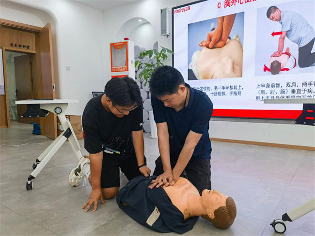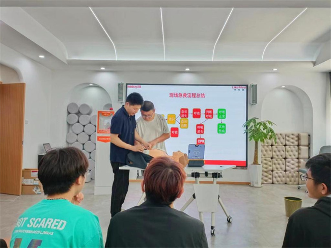 培訓老師通過理論講解、模擬演示的方式,重點講解了學習急救的現(xiàn)實意義、心肺復蘇的操作流程、人工呼吸和胸外心臟按壓技能、AED的使用方法、現(xiàn)場創(chuàng)傷救護等內(nèi)容。從AED使用的原理、目的、適應癥、操作規(guī)范、使用的注意事項等方面進行了詳細的講解,并利用人體模型進行了現(xiàn)場心肺復蘇及自動體外除顫器操作演示。