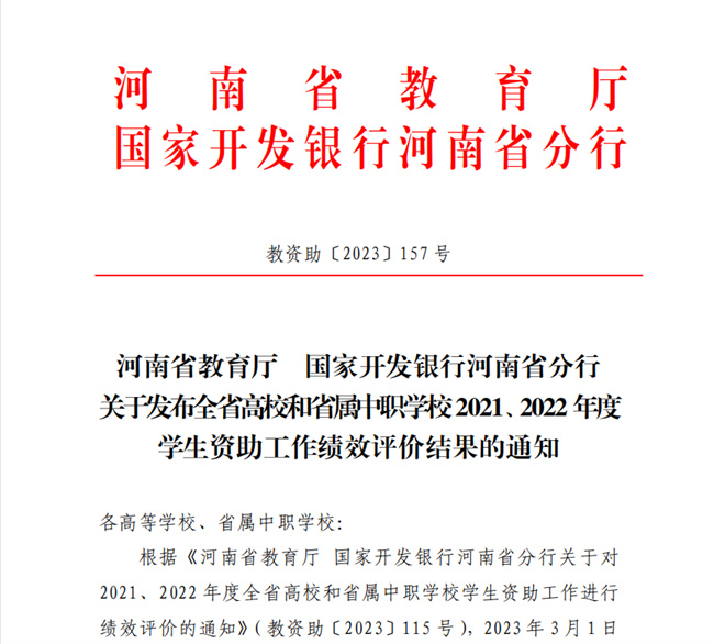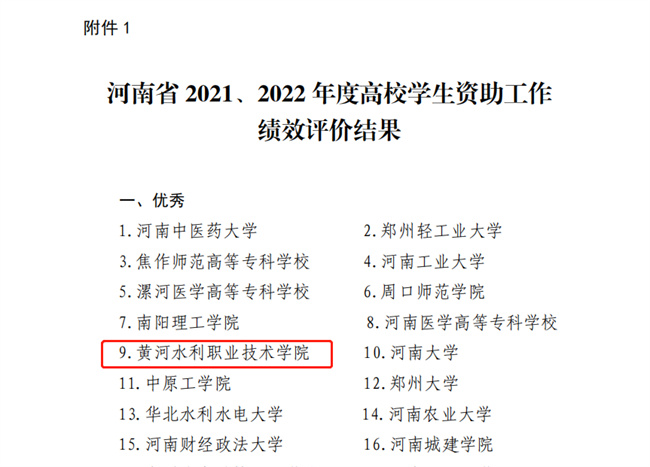 中新河南網(wǎng)5月31日電(董新法) 近日,河南省教育廳會(huì)同國(guó)家開(kāi)發(fā)銀行河南省分行對(duì)全省高校和省屬中職學(xué)校2021、2022年度學(xué)生資助工作進(jìn)行了全面績(jī)效評(píng)價(jià)。本次績(jī)效評(píng)價(jià)分為學(xué)校自評(píng)、專(zhuān)家組復(fù)評(píng)和實(shí)地復(fù)核三個(gè)階段,考核內(nèi)容包括基礎(chǔ)保障、日常管理、管理績(jī)效和附加評(píng)價(jià)等。在對(duì)155所高校的績(jī)效評(píng)價(jià)中,共有37所高校獲評(píng)“優(yōu)秀”等級(jí),黃河水利職業(yè)技術(shù)學(xué)院位列其中。