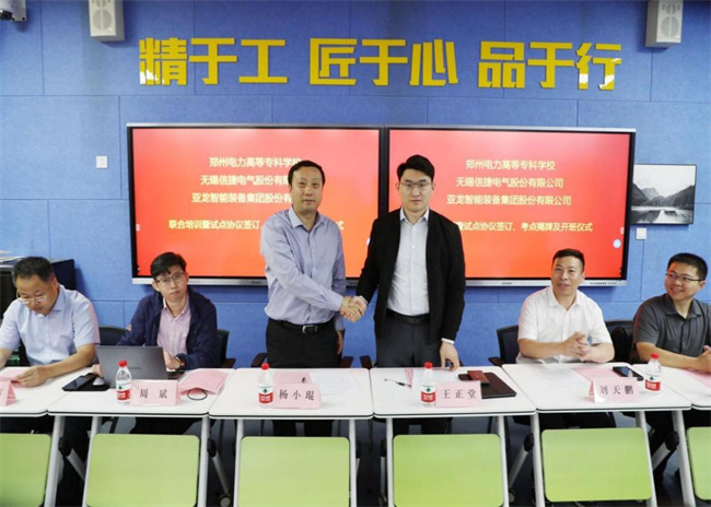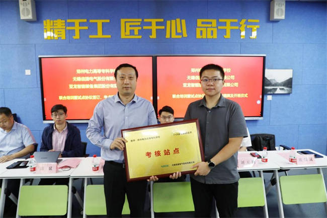 鄭州電力高等?茖W校副校長楊小琨、無錫信捷電氣股份有限公司公共及教育部事業(yè)部部長王正堂進行“1+X”可編程控制器系統(tǒng)應用編程考核站點的簽約,并完成考核站點的授牌。