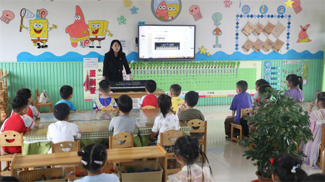 在東和店鎮(zhèn)中心幼兒園,藝術(shù)教學(xué)部副主任馬嬌為幼兒園的小朋友們進(jìn)行了電子琴教學(xué),教授孩子們認(rèn)識(shí)鍵盤、感受音高,學(xué)習(xí)音符和節(jié)奏,彈唱兒歌《小星星》,引導(dǎo)上臺(tái)彈奏電子琴,在孩子們心中播種下音樂的種子,期待萌芽生長(zhǎng)、花開綻放。
