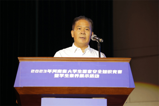 黃才華代表省委教育工委、省教育廳向長期關(guān)心支持高校發(fā)展、百忙中蒞臨此次活動的省委政法委、市公安局的領(lǐng)導(dǎo)同志表示熱烈的歡迎,向觀摩此次比賽活動的高校領(lǐng)導(dǎo)、師生代表表示誠摯的問候,向沖刺到?jīng)Q賽現(xiàn)場的代表隊(duì)表示熱烈的祝賀,向承辦此次比賽活動的河南中醫(yī)藥大學(xué)校領(lǐng)導(dǎo),校黨委宣傳部、黨委學(xué)工部、校團(tuán)委等部門付出的艱辛和努力表示衷心的感謝。黃才華指出,中央和省委高度重視國家安全教育工作,從成立中央國家安全委員會,建立集中統(tǒng)一、高效權(quán)威的國家安全體制,到加快推進(jìn)國家安全法治建設(shè),再到明確國家安全戰(zhàn)略方針和總體部署,一系列重大創(chuàng)新舉措陸續(xù)出臺,為做好國家安全工作提供了根本遵循。省委教育工委、省教育廳認(rèn)真貫徹中央和省委關(guān)于國家安全教育工作的決策部署,在國家安全教育體系建設(shè)、教育資源建設(shè)、教育教學(xué)活動建設(shè)等方面持續(xù)發(fā)力,全省高校國家安全教育工作取得明顯成效。希望各高校以此次活動為契機(jī),深入貫徹落實(shí)總體國家安全觀,將國家安全教育作為立德樹人的重要內(nèi)容,多措并舉推進(jìn)國家安全教育,不斷增強(qiáng)師生國家安全意識和素養(yǎng),為筑牢全省教育系統(tǒng)國家安全防線不斷發(fā)揮高校優(yōu)勢、提供高校智慧、貢獻(xiàn)高校力量。