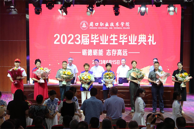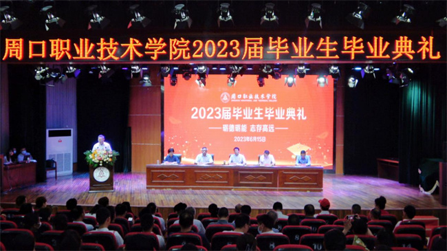 畢業(yè)典禮在莊嚴的國歌聲中拉開帷幕。校黨委副書記、工會主席郭汝禮宣讀《河南省教育廳關于表彰2023年河南省優(yōu)秀應屆大中專畢業(yè)生的決定》;副校長于愛霞宣讀《周口職業(yè)技術學院關于表彰2023年優(yōu)秀大中專畢業(yè)生的決定》。