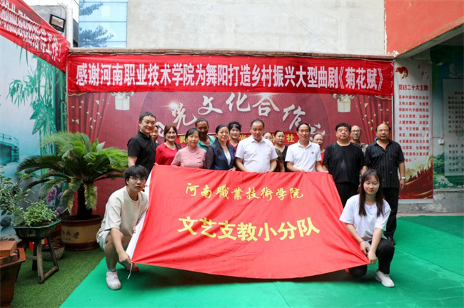 座談會后,學校文藝幫扶小分隊前往賈湖曲劇團排演鄉(xiāng)村振興曲劇《菊花賦》《社會主義核心價值觀曲劇組歌》,到賈湖文化遺址進行骨笛微紀錄片拍攝前采風,開發(fā)賈湖文化研學課程、對接文藝支教前期工作。科技小分隊帶領企業(yè)領導到舞陽縣辛安鎮(zhèn)劉莊進行黨支部共建、產(chǎn)業(yè)園實地調研和技術服務。思政文化小分隊到舞陽縣辛安鎮(zhèn)實驗學校,掛牌馬克思主義學院送教工作站,文旅學院、馬克思主義學院分別開展思政課和傳統(tǒng)文化進校園活動,推動大中小學思想政治教育一體化建設,弘揚中華優(yōu)秀傳統(tǒng)文化。