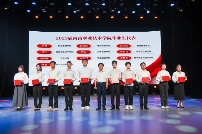 隨后,與會師生一同觀看了歡送畢業(yè)生匯演。畢業(yè)歌曲聯(lián)唱《鳳凰花開的路口》和《光陰的故事》引起了全場同學(xué)的強(qiáng)烈共鳴,反映了畢業(yè)生們對校園生活的懷念和不舍;獲全國高校心理情景劇二等獎的《尋心》,講述了當(dāng)代大學(xué)生面臨的心理困惑和領(lǐng)悟成長的故事;獲河南省大學(xué)生科技文化藝術(shù)節(jié)舞蹈類一等獎的《灼灼芳華》和快板書《道路》展現(xiàn)了當(dāng)代河職學(xué)子的青春活力與時代擔(dān)當(dāng);典禮在歌伴舞《復(fù)興的力量》中緩緩落幕,與會領(lǐng)導(dǎo)、老師和畢業(yè)生代表一起合影留念。
