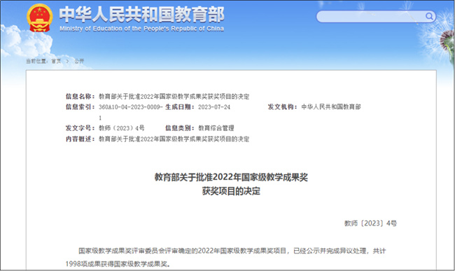 國家級教學(xué)成果獎是1989年由國務(wù)院確定的國家級獎勵,被視為與國家科技成果獎并列的國家級獎勵,每四年評選一次,是加快建設(shè)教育強國、落實立德樹人根本任務(wù)的重要舉措,是對學(xué)校人才培養(yǎng)工作和教育教學(xué)改革成果的檢閱和展示,代表了目前我國教育教學(xué)工作的最高水平。
