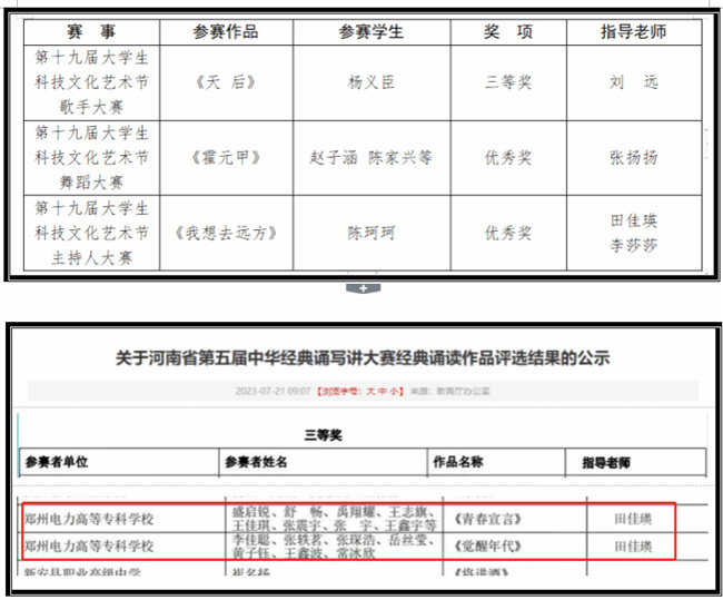 學(xué)校電氣工程學(xué)院師恩達(dá)同學(xué)獲得“2022年度中國(guó)大學(xué)生自強(qiáng)之星”榮譽(yù)稱號(hào);學(xué)校獲得河南省第十九屆大學(xué)生科技文化藝術(shù)節(jié)歌手大賽三等獎(jiǎng)一項(xiàng)(指導(dǎo)老師:劉遠(yuǎn))、舞蹈大賽優(yōu)秀獎(jiǎng)一項(xiàng)(指導(dǎo)老師:張揚(yáng)揚(yáng))、主持人大賽優(yōu)秀獎(jiǎng)一項(xiàng)(指導(dǎo)老師:田佳瑛、李莎莎);學(xué)校獲得河南省第五屆中華經(jīng)典誦寫講大賽經(jīng)典誦讀作品大賽三等獎(jiǎng)二項(xiàng)(指導(dǎo)老師:田佳瑛)。