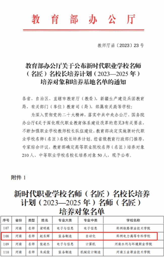 中新河南網(wǎng)10月10日電(李安杰) 近日,教育部辦公廳公布新時(shí)代職業(yè)學(xué)校名師(名匠)名校長(zhǎng)培養(yǎng)計(jì)劃(2023—2025 年)培養(yǎng)對(duì)象和培養(yǎng)基地名單,鄭州電力高等專科學(xué)校教師趙東輝成功入選裝備制造自動(dòng)化類名師(名匠)名校長(zhǎng)培養(yǎng)計(jì)劃(2023—2025 年)名師(名匠)培養(yǎng)對(duì)象。