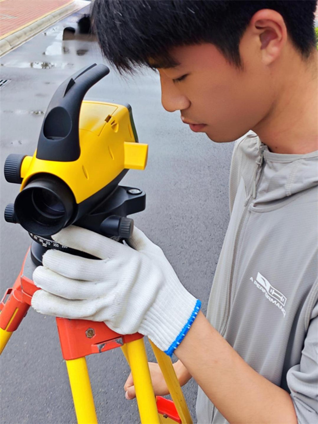 工程測(cè)量競(jìng)賽屬于室外項(xiàng)目。剛開始訓(xùn)練時(shí)正值暑假,頭頂著烈日穿梭在校園的每個(gè)角落,汗水浸透衣物,我卻樂在其中。一級(jí)導(dǎo)線測(cè)量訓(xùn)練從起初的角度不閉合,到后來的迅速測(cè)量完畢且數(shù)據(jù)閉合無誤;二等水準(zhǔn)測(cè)量訓(xùn)練從起初時(shí)測(cè)繩都會(huì)打結(jié),到后來的如臂使指,整個(gè)備賽過程中我的各方面能力也得到突飛猛進(jìn)地提升。1:500數(shù)字測(cè)圖可以說是競(jìng)賽中的一大難點(diǎn),這一賽項(xiàng)中不單單只有外業(yè)測(cè)量,還有內(nèi)業(yè)繪圖內(nèi)容。由于內(nèi)業(yè)繪圖的特殊性,需要一人使用電腦進(jìn)行成圖,這就意味著有一個(gè)人要付出額外的時(shí)間來有針對(duì)性地進(jìn)行學(xué)習(xí)和訓(xùn)練。最終,這一任務(wù)由我來完成。白天的時(shí)間多用來進(jìn)行外業(yè)測(cè)量訓(xùn)練,內(nèi)業(yè)畫圖這一項(xiàng)就放在晚上進(jìn)行學(xué)習(xí)。不知多少個(gè)夜晚,李春鋒老師陪著我訓(xùn)練至深夜,我的繪圖水平也迅速提高。在數(shù)字化測(cè)圖的外業(yè)測(cè)量中,我們四人分工明確,不斷磨合,根據(jù)黎瑾慧老師和尹冬麗老師的指導(dǎo),將2017版國家基本比例尺地圖圖式進(jìn)行抄錄和記憶。所學(xué)的知識(shí)得到一次次實(shí)踐,感受到自己一點(diǎn)點(diǎn)地不斷進(jìn)步,滿足感充斥在每個(gè)人的心間。