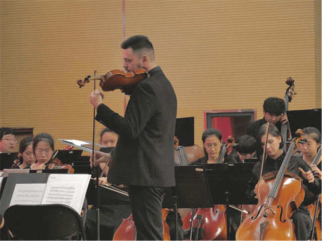 演出期間,Andrew Job Davis (安卓)指揮以“趣味講解+現(xiàn)場演奏”的方式,用激情而獨具魅力的指揮與有趣而簡單易懂的語言,為在場的師生普及了交響樂分類——弦樂組、木管組、銅管組、打擊樂組等,通過講明這些樂器的音區(qū)、音色等特點和現(xiàn)場示范,讓該校師生很好地感受了這些樂器的特點及表現(xiàn)力。