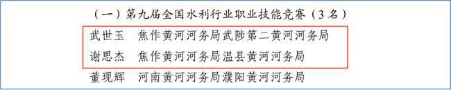 武世玉2014年畢業(yè)于該校水工專業(yè),現(xiàn)為黃河水利委員會焦作黃河河務(wù)局武陟第二河務(wù)局職工。他立志扎根基層,服務(wù)治黃一線,曾榮獲“河南省五一勞動獎?wù)?rdquo;“黃委技術(shù)能手”“河南河務(wù)局愛崗敬業(yè)道德模范”“最美河南黃河人”等榮譽稱號,并在第九屆全國水利行業(yè)職業(yè)技能競賽——全國河道修防工職業(yè)技能競賽,榮獲冠軍。謝思杰2014年畢業(yè)于該校水工專業(yè),現(xiàn)為黃河水利委員會焦作黃河河務(wù)局溫縣河務(wù)局職工。他扎根治黃一線,愛崗敬業(yè)、拼搏奉獻,曾榮獲“河南省五一勞動獎?wù)?rdquo;“黃委技術(shù)能手”“河南河務(wù)局優(yōu)秀技能人才”等榮譽稱號,并在第九屆全國水利行業(yè)職業(yè)技能競賽——全國河道修防工職業(yè)技能競賽,榮獲亞軍。