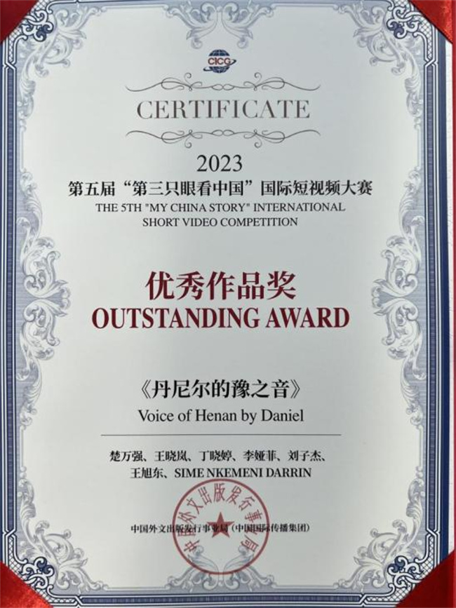 第五屆“第三只眼看中國”國際短視頻大賽共征集到來自世界各地作品57865部,覆蓋五大洲的80多個國家,投稿作品平臺閱讀量達(dá)到4.3億,最終評選出各類獎項共計96個;顒幼6月份啟動以來,國際教育學(xué)院精心籌備組織,結(jié)合學(xué)校留學(xué)生丹尼爾的學(xué)習(xí)生活經(jīng)歷,真實的展現(xiàn)了留學(xué)生學(xué)習(xí)豫劇的過程,將豫劇文化呈現(xiàn)給廣大海內(nèi)外觀眾,最終榮獲優(yōu)秀作品獎。