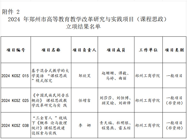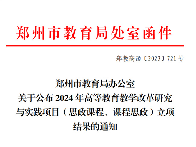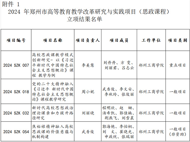 中新河南網(wǎng)11月6日電(史亞麗) 近日,鄭州市教育局發(fā)布了《鄭州市教育局辦公室關(guān)于公布2024年高等教育教學(xué)改革研究與實(shí)踐項(xiàng)目(思政課程、課程思政)立項(xiàng)結(jié)果的通知》(鄭教高函〔2023〕721號)文件,鄭州工商學(xué)院7個(gè)項(xiàng)目獲得立項(xiàng)。其中,思政課程立項(xiàng)項(xiàng)目4項(xiàng),課程思政立項(xiàng)項(xiàng)目3項(xiàng)。