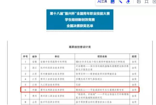 中新河南網(wǎng)11月17日電 11月10日至11日,第十八屆“振興杯”全國(guó)青年職業(yè)技能大賽學(xué)生組創(chuàng)新創(chuàng)效競(jìng)賽全國(guó)決賽在河南鄭州舉行落下帷幕。黃河水利職業(yè)技術(shù)學(xué)院水利工程學(xué)院項(xiàng)目《根潤(rùn)壓沁——節(jié)能減排的負(fù)水頭灌溉決策專家》榮獲高職組創(chuàng)意設(shè)計(jì)類全國(guó)金獎(jiǎng)。這是黃河水院首次在該項(xiàng)賽事中榮獲全國(guó)金獎(jiǎng),實(shí)現(xiàn)了新突破。