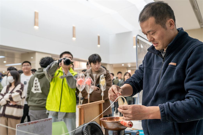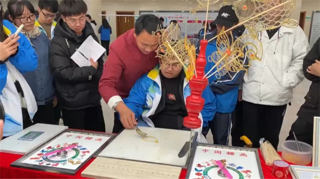 活動伊始,糖畫體驗展臺便擠滿了學生,只見糖畫非遺傳承人將糖加熱后在鐵板上一陣行云流水,馬上就出現了一個個栩栩如生的飛龍、螃蟹、小豬等,令人贊嘆不已。參與體驗的學生躍躍欲試,在老師指導下紛紛做出了自己喜歡的糖畫模樣。學生們拿著糖畫,仿佛回到了快樂的童年時光。