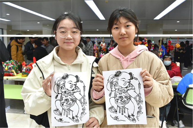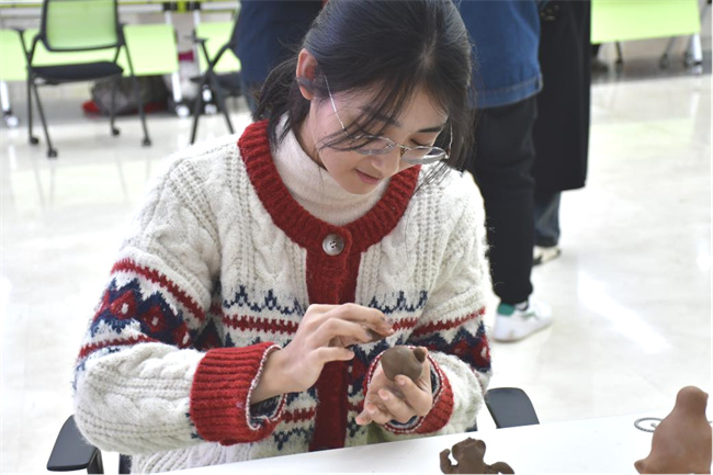 活動現場,同學們還積極參與了剪紙、泥塑、吹糖人、皮影、布老虎、紙雕、面塑等各類非遺項目體驗,他們根據自己的興趣愛好向各項目傳承人請教學藝,經過幾輪學習,有的學生學會了手工布藝基本繡法,有的學生能捏出泥塑的雛形……大家從直觀的作品和技藝中進一步了解了非遺所蘊含的豐富的文化底蘊。
