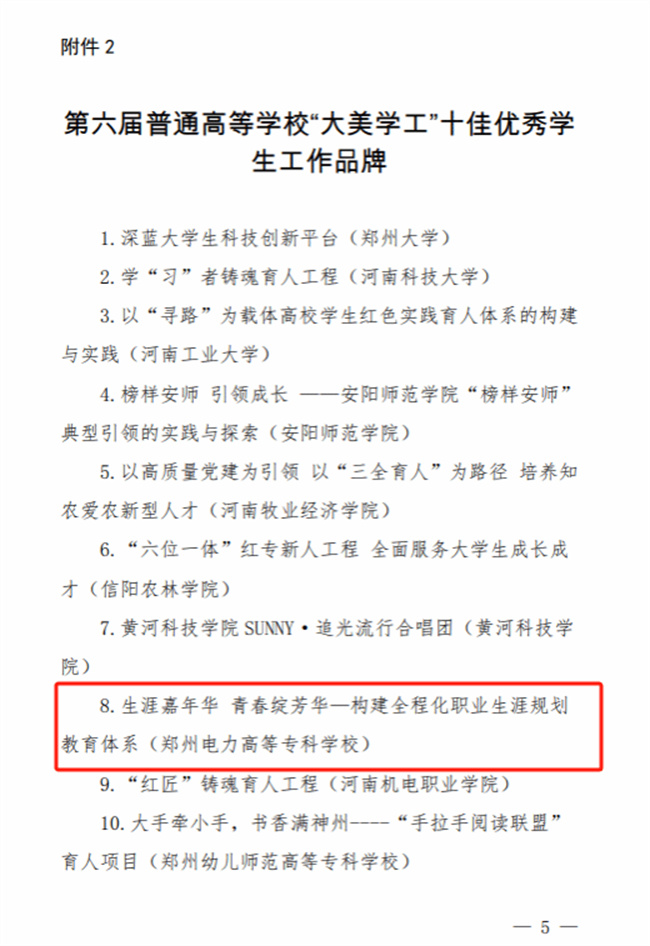 中新河南網(wǎng)11月28日電(王家琪) 近日,河南省第六屆普通高等學(xué)校“大美學(xué)工”評選結(jié)果公示,鄭州電力高等?茖W(xué)校申報(bào)的“生涯嘉年華 青春綻芳華—構(gòu)建全程化職業(yè)生涯規(guī)劃教育體系”獲評十佳學(xué)生工作品牌。“大美學(xué)工”由河南省教育廳組織評選,經(jīng)過網(wǎng)絡(luò)評審、專家評議、現(xiàn)場展示、專家終審等環(huán)節(jié),此次是鄭州電力高等?茖W(xué)校繼2021年連續(xù)第二次獲此殊榮。