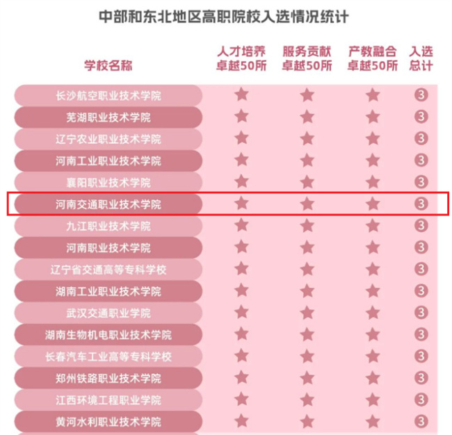 河南交通職業(yè)技術學院入選中部和東北地區(qū)三大卓越高等職業(yè)院校榜單50強