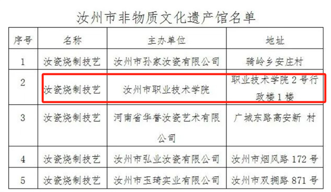 汝州市文化廣電和旅游局在前期經(jīng)過篩選考察,最終確定汝州職業(yè)技術(shù)學(xué)院陶瓷樓1樓為汝州市非物質(zhì)文化遺產(chǎn)傳承體驗(yàn)中心,確定汝州職業(yè)技術(shù)學(xué)院陶瓷館為非物質(zhì)文化遺產(chǎn)館。